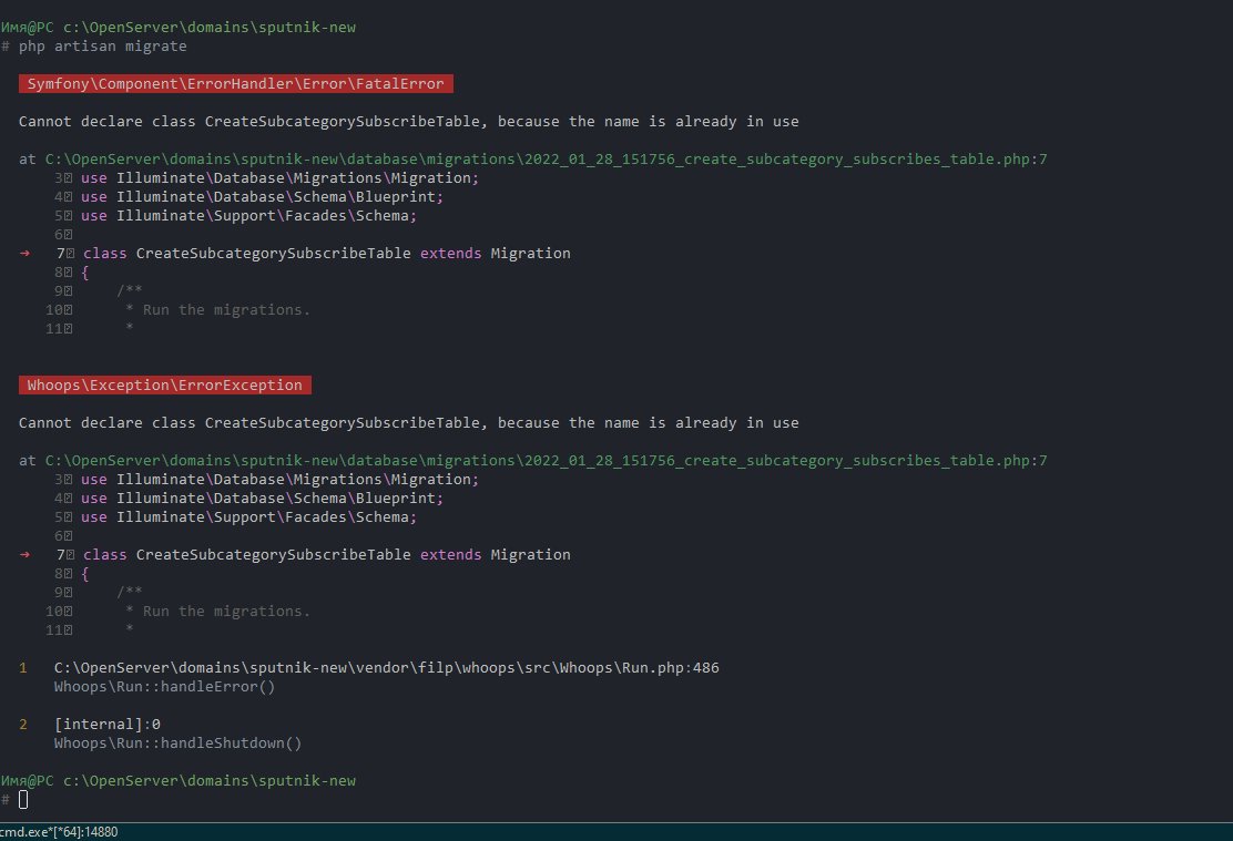 Приветствую. Собственно вот такая вот ошибка: Cannot declare class CreateSubcategorySubscribeTable, because the name is already in use