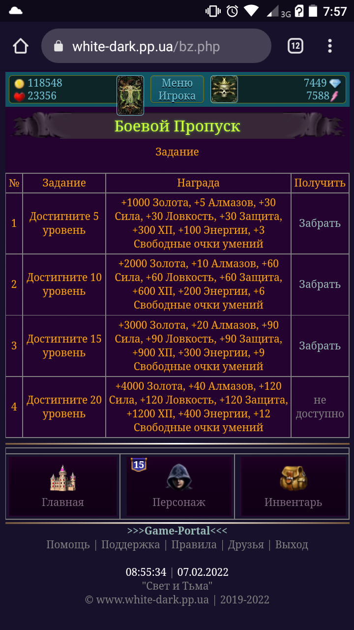 <center><font color="orange">+4000 Золота, +40 Алмазов, +120 Сила, +120 Ловкость, +120 Защита, +1200 ХП, +400 Энергии, +12 Свободные очки умений</font></center>