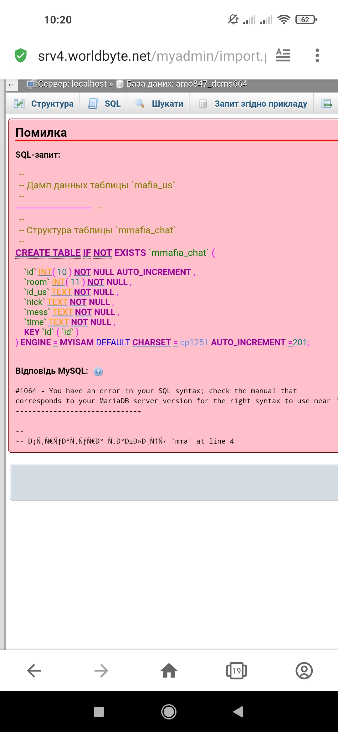 Залив базу пишет ошибка