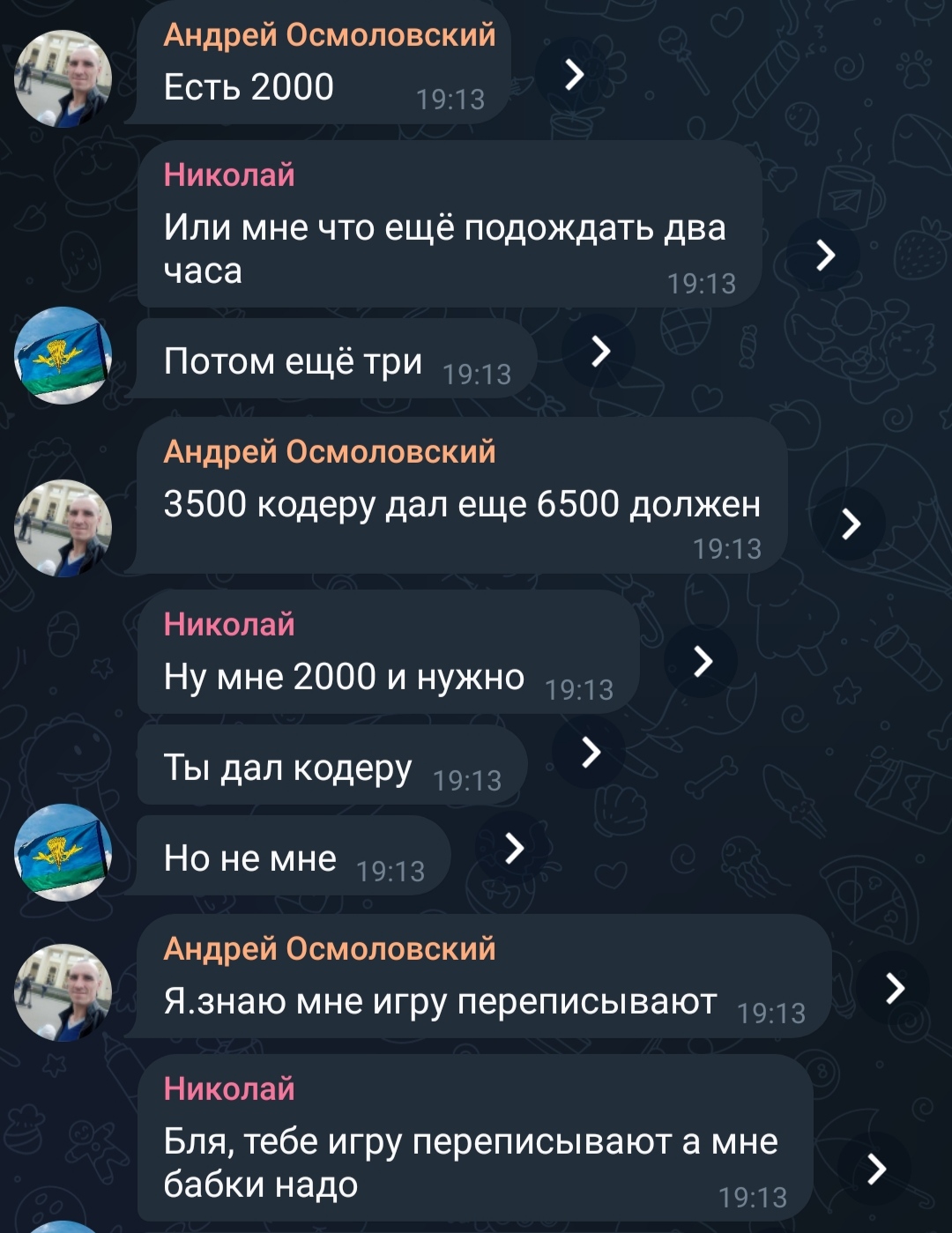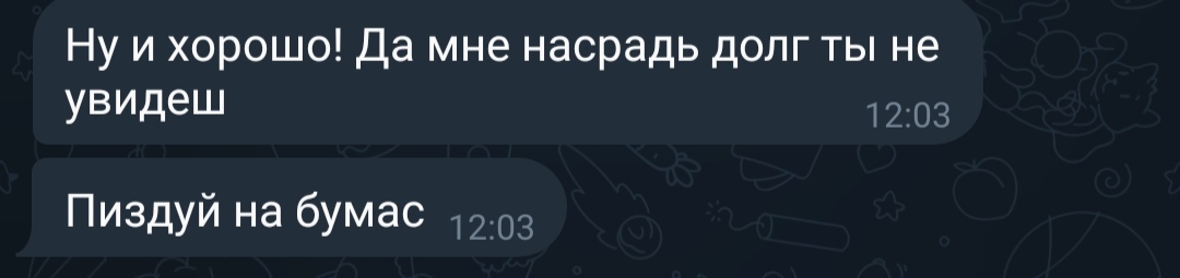Ты не чего не прислал бы, копейки за 2 месяца отдать не мог , и отмазки писал ) уже все поняли что ты пустослов без денег )