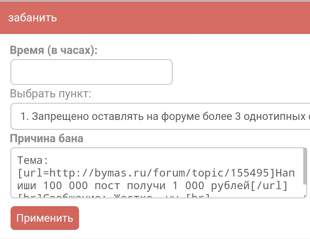 1. Запрещено оставлять на форуме более 3 однотипных сообщений подряд (Конкурсы исключение). (8 час)