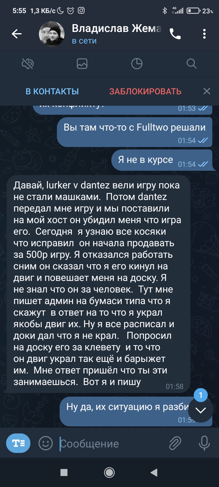 Всем ку решал тему с админом Denis Legran о https://bym.guru/forum/topic/155537 предоставил все скрини которые хотел и тд даже доступ давал к переписке в тг ну данный админ за два дня так и не может понять ситуации после кражи движка дантесом там еще остался мой шел я могу заходить в файлы игры и делать что хочу ну сегодня открылся розговор дантес подозревает партнера https://bym.guru/id104097 что это он мне дал данные от хостинга и апельсин слил игру ну игру дал ему я так вот в чем вывод не смотря на все доки что крыса дантес слил игру удалил все и убежал на другой хостинг ну админ ноль решении зато он выслушал балаболство дантеса без единого дока или скрина тупо верит словам и сейчас копает чтоб повесит на доску апельсина за слив игры в дантеса вы понимает чел украл игру у меня ну пох админ копает кто украл игру в него