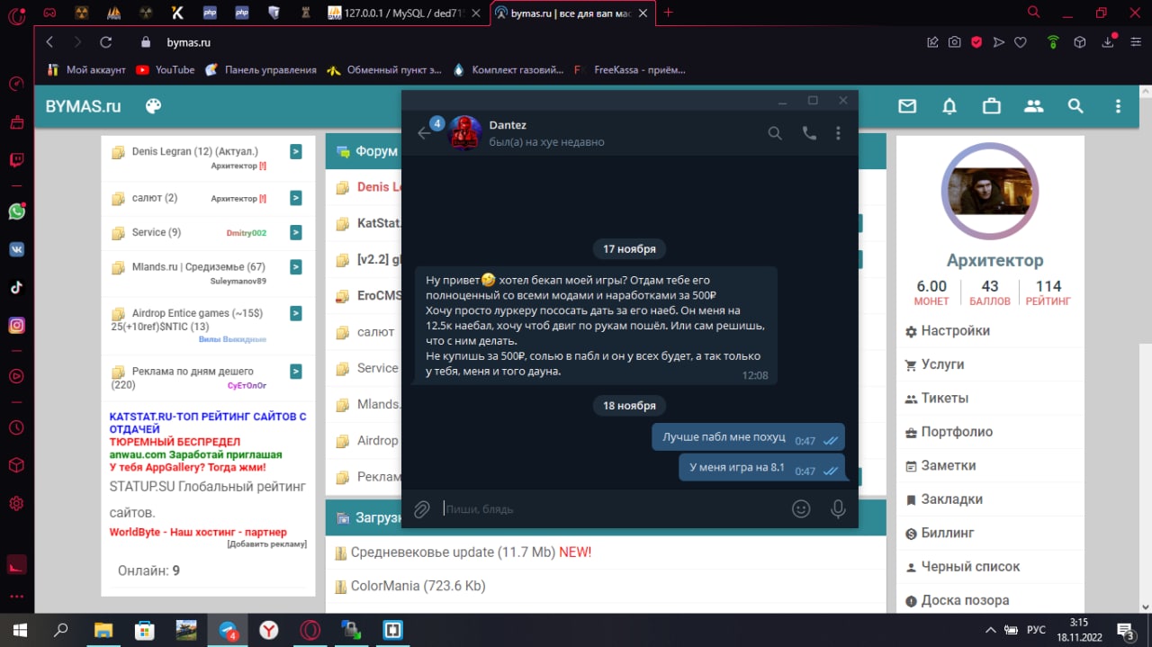 Всем ку решал тему с админом Denis Legran о https://bym.guru/forum/topic/155537 предоставил все скрини которые хотел и тд даже доступ давал к переписке в тг ну данный админ за два дня так и не может понять ситуации после кражи движка дантесом там еще остался мой шел я могу заходить в файлы игры и делать что хочу ну сегодня открылся розговор дантес подозревает партнера https://bym.guru/id104097 что это он мне дал данные от хостинга и апельсин слил игру ну игру дал ему я так вот в чем вывод не смотря на все доки что крыса дантес слил игру удалил все и убежал на другой хостинг ну админ ноль решении зато он выслушал балаболство дантеса без единого дока или скрина тупо верит словам и сейчас копает чтоб повесит на доску апельсина за слив игры в дантеса вы понимает чел украл игру у меня ну пох админ копает кто украл игру в него