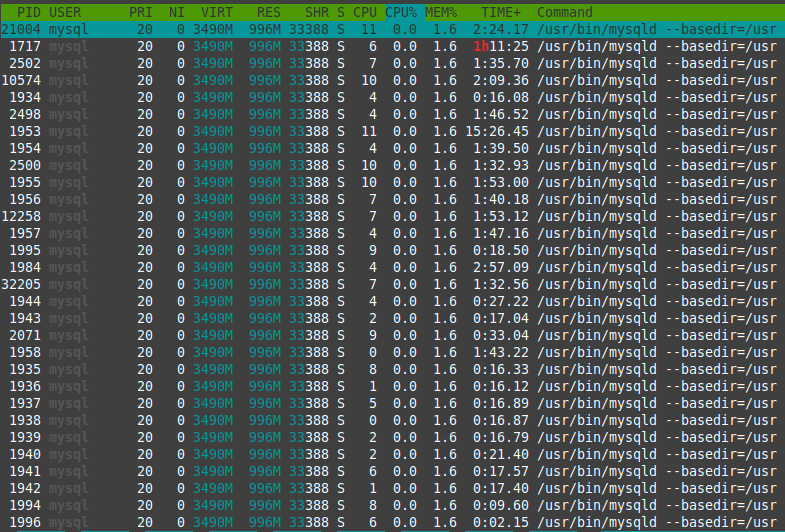 Процессы mysql занимают все 12 ядер процессора. Настройки по умолчанию.