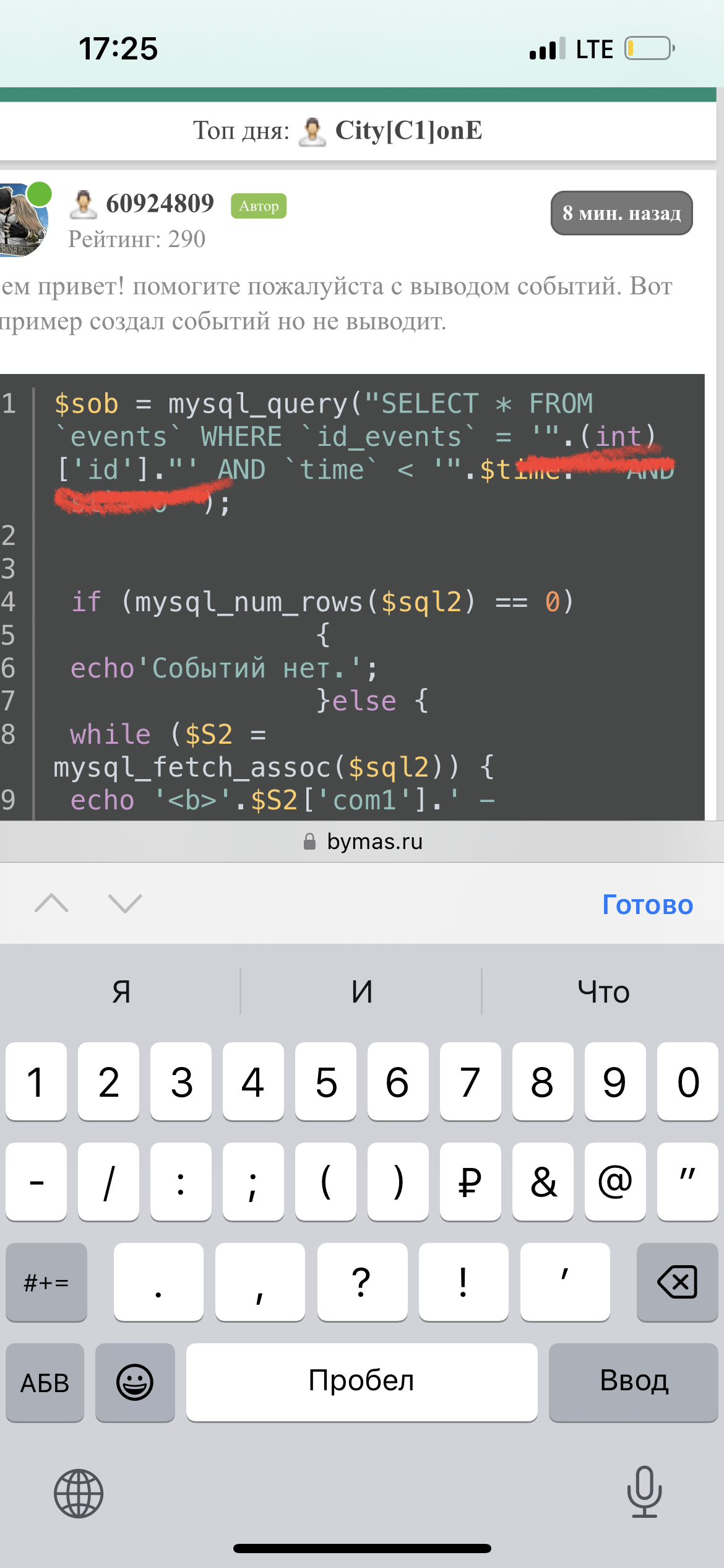 $sob = mysql_query("SELECT * FROM `events` WHERE `id_events` = '".(int)['id']."' AND `time` < '".$time."' AND `st`='0'"); if (mysql_num_rows($sql2) == 0) { echo'Событий нет.'; }else { while ($S2 = mysql_fetch_assoc($sql2)) { echo '<b>'.$S2['com1'].' - '.$S2['com2'].'</b><br/>'; echo 'П1 - <b>'.$S2['k1'].'</b> Х - <b>'.$S2['k2'].'</b> П2 - <b>'.$S2['k3'].'</b><br/>'; }} ________