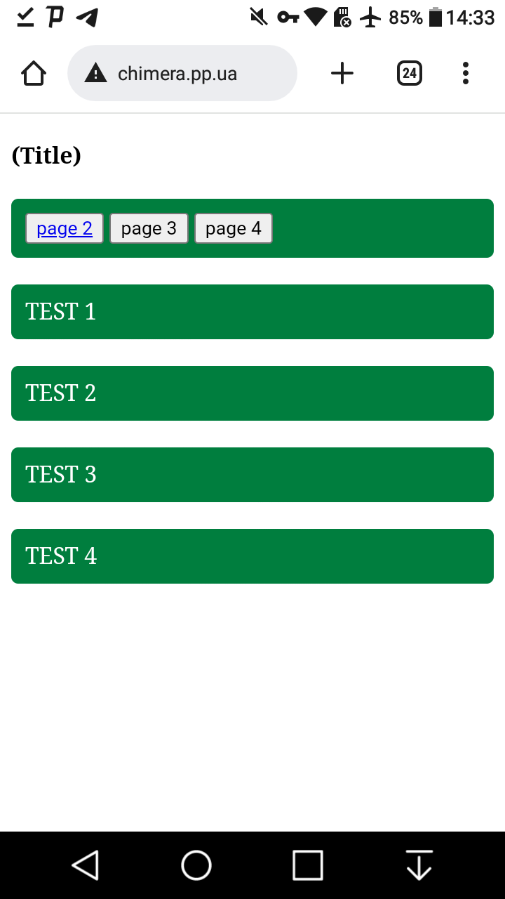 <!DOCTYPE html PUBLIC "-//WAPFORUM//DTD XHTML Mobile 1.0//EN" "http://www.wapforum.org/DTD/xhtml-mobile10.dtd"> <html xmlns="http://www.w3.org/1999/xhtml"> <head> <title>TEST TITLE</title> <link href="/style.css" rel="stylesheet" type="text/css"> </head> <html> <script> let width = screen.width; </script> <body> <h4>(Title)</h4> <div class="div5"> <button type="input" name="/page2"><a href="/page2.html">page 2</a></button>  <a href="/page3.html"><button>page 3 </button></a>  <a href="/page4.html"><button>page 4 </button></a> </div> <br> <div class="div5">TEST 1</div> <br> <div class="div5">TEST 2</div>  <br> <div class="div5">TEST 3</div>  </br> <div class="div5">TEST 4</div> <body> </html>