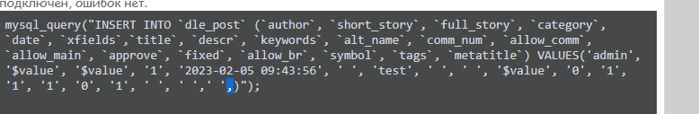 mysql_query("INSERT INTO `dle_post` (`autor`, `short_story`, `full_story`, `category`, `date`, `xfields`,`title`, `descr`, `keywords`, `alt_name`, `comm_num`, `allow_comm`, `allow_main`, `approve`, `fixed`, `allow_br`, `symbol`, `tags`, `metatitle`) VALUES('admin', '$value', '$value', '1', '2023-02-05 09:43:56', ' ', 'test', ' ', ' ', '$value', '0', '1', '1', '1', '0', '1', ' ', ' ',' ',)"); ________
