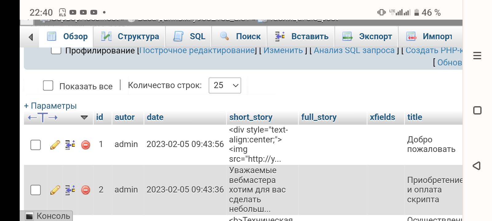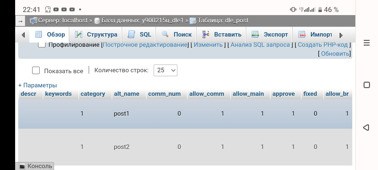 mysql_query("INSERT INTO `dle_post` (`autor`, `short_story`, `full_story`, `category`, `date`, `xfields`,`title`, `descr`, `keywords`, `alt_name`, `comm_num`, `allow_comm`, `allow_main`, `approve`, `fixed`, `allow_br`, `symbol`, `tags`, `metatitle`) VALUES('admin', '$value', '$value', '1', '2023-02-05 09:43:56', ' ', 'test', ' ', ' ', '$value', '0', '1', '1', '1', '0', '1', ' ', ' ',' ',)"); В Базе данных префикс dle, а именно таблица. Как написали посте №7. Во-первых. Во-вторых, пустые значение SQL не примет.
