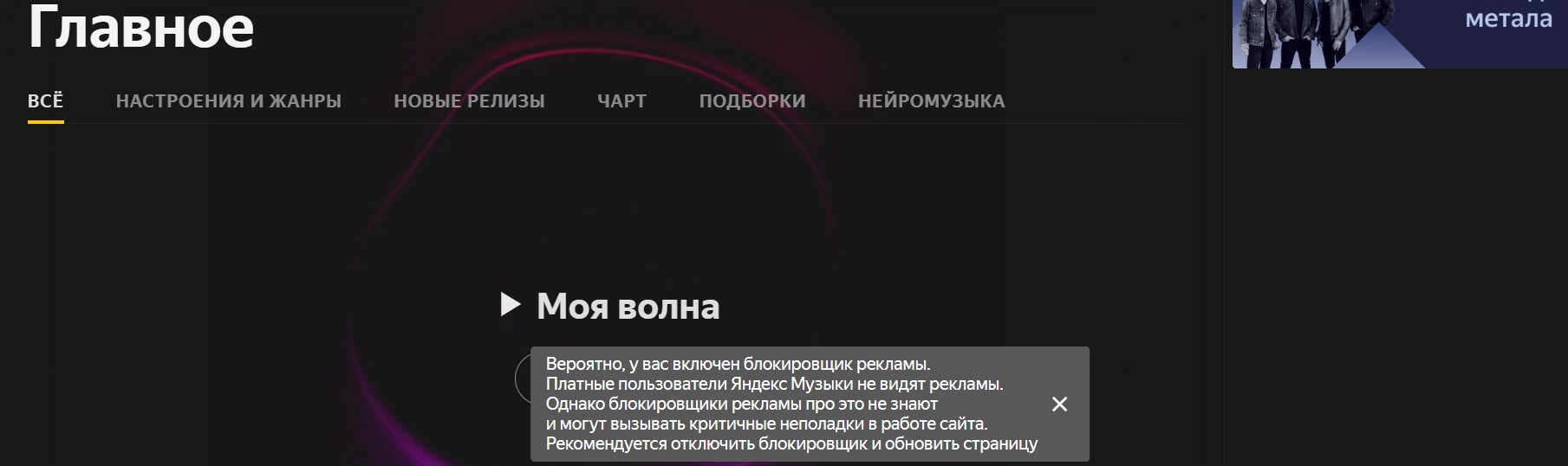мне наоборот надо ее включить и отключить блокировщик, потому этот урод блокирует не только рекламу но и некоторые ява скрипты на сайтах, в связи с этим сайт отображается не совсем корректно. Даже когда на яндекс музыку заходишь