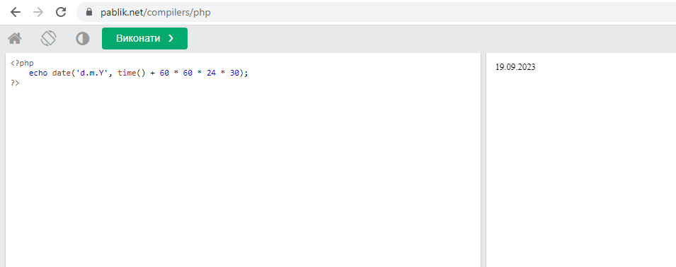 $m = date('d.m.Y', time() + 60 * 60 * 24 * 30); DB::run() -> query("UPDATE `table` SET `motime`= '".$m."' WHERE `id`=?;", array($pr)); ------