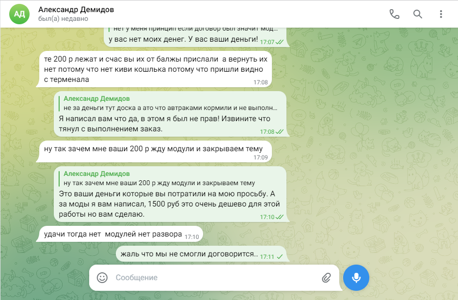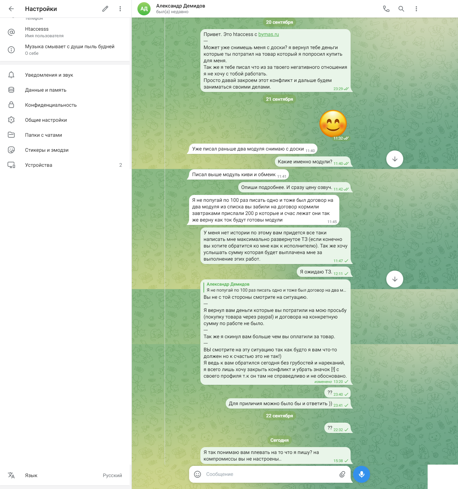 Приложу скриншот нашей "Продуктивной" беседы. (Тут на bym.guru) он добавил меня в ЧС по этому писал ему в ТГ.