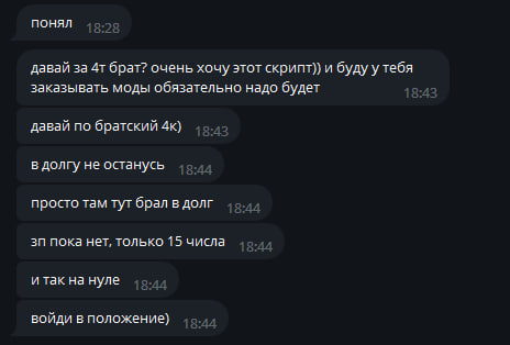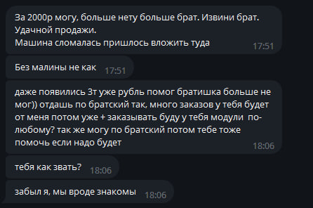 Да не храню я диалоги, крыса ты), помнишь как ты еще писал войди в положение), ты и тогда думал думал что в одни руки за 2к получишь?