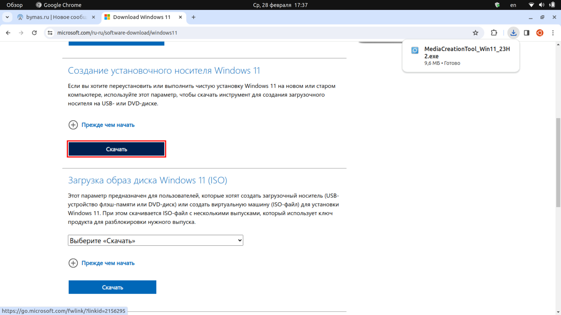 качать нужно не образ, качать нужно по второй кнопке - Средство создания носителя, в нём можно создать как флешку, так и iso
