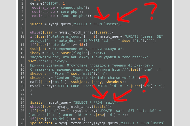 <?php define('GITOP', 1); require_once ('connect.php'); require_once ('core.php'); require_once ('function.php'); $users = mysql_query("SELECT * FROM `users"); while($user = mysql_fetch_array($users)){ if($user['platforms_count'] == 0) mysql_query("UPDATE `users` SET `auto_del` = (`auto_del` + 1) WHERE `id` = '".$user['id']."'"); if($user['auto_del'] >= 45){ $subject = "Уведомление об удалении аккаунта"; $body = "Вы, ".$user["login"]."!<br/> Уведомляем вас, что ваш аккаунт был удален в топе http://".$set["home"]."<br/> Причина удаления: Отсутствие площадок в течении 45 дней<br/> С уважением, администрация топ-рейтинга http://".$set["home"]; $headers = "From: ".$set['mail']." n"; $headers .= "Content-Type: text/html; charset=utf-8n"; mail($user['mail'], $subject, $body, $headers); mysql_query("DELETE FROM `users` WHERE `id` = '".$user['id']."'"); } } $saits = mysql_query("SELECT * FROM `sait"); while($row = mysql_fetch_array($saits)){ if($row['ban'] == 1) mysql_query("UPDATE `sait` SET `auto_del` = (`auto_del` + 1) WHERE `id` = '".$row['id']."'"); if($row['auto_del'] >= 30){ $polzovatel = mysql_fetch_array(mysql_query("SELECT * FROM `users` WHERE `id` = '".$row['id_user']."'")); $subject = "Уведомление об удалении площадки"; $body = "Вы, ".$polzovatel["login"]."!<br/> Уведомляем вас, что ваш сайт http://".$row["url"]." был автоматически удален в топе http://".$set["home"]."<br/> С уважением, администрация топ-рейтинга http://".$set["home"]; $headers = "From: ".$set['mail']." n"; $headers .= "Content-Type: text/html; charset=utf-8n"; mail($polzovatel['mail'], $subject, $body, $headers); mysql_query("DELETE FROM `sait` WHERE `id` = '".$row['id']."'"); mysql_query("UPDATE `users` SET `platforms_count` = (`platforms_count` - 1) WHERE `id` = '".$row['id_user']."'"); } if($row['ban'] == 0){ if($row['hosts'] == 0) mysql_query("UPDATE `sait` SET `auto_ban` = (`auto_ban` + 1) WHERE `id` = '".$row['id']."'"); if($row['auto_ban'] == 29){ $polzovatel = mysql_fetch_array(mysql_query("SELECT * FROM `users` WHERE `id` = '".$row['id_user']."'")); $subject = "Уведомление о скорой блокировке площадки"; $body = "Вы, ".$polzovatel["login"]."!<br/> Уведомляем вас, что ваш сайт http://".$row["url"]." завтра будет автоматически заблокирован в топе http://".$set["home"]."<br/> Причина блокировки: Нулевая посещаемость в течении 29 дней<br/> Возможно у вас не установлен код счетчика или ваш сайт недоступен<br/> Просим вас установить счетчик на своем сайте/вернуть работоспособность своему сайту<br/> С уважением, администрация топ-рейтинга http://".$set["home"]; $headers = "From: ".$set['mail']." n"; $headers .= "Content-Type: text/html; charset=utf-8n"; mail($polzovatel['mail'], $subject, $body, $headers); } if($row['auto_ban'] >= 30){ mysql_query("UPDATE `sait` SET `ban` = '1', `ban_time` = '".time()."', `ban_reason` = 'Нулевая посещаемость в течении 30 дней', `auto_ban` = '0' WHERE `id` = '".$row['id']."'"); $polzovatel = mysql_fetch_array(mysql_query("SELECT * FROM `users` WHERE `id` = '".$row['id_user']."'")); $subject = "Уведомление о блокировки площадки"; $body = "Вы, ".$polzovatel["login"]."!<br/> Уведомляем вас, что ваш сайт http://".$row["url"]." был автоматически заблокирован в топе http://".$set["home"]."<br/> Причина блокировки: Нулевая посещаемость в течении 30 дней<br/> Возможно у вас не установлен код счетчика или ваш сайт недоступен<br/> С уважением, администрация топ-рейтинга http://".$set["home"]; $headers = "From: ".$set['mail']." n"; $headers .= "Content-Type: text/html; charset=utf-8n"; mail($polzovatel['mail'], $subject, $body, $headers); } if($row['auto_ban'] != 0 AND $row['hosts'] > 0) mysql_query("UPDATE `sait` SET `auto_ban` = '0' WHERE `id` = '".$row['id']."'"); } mysql_query("UPDATE `sait` SET `pk30` = (`pk30` + ".$row['pk2']."), `mob30` = (`mob30` + ".$row['mob2']."), `hosts30` = (`hosts30` + ".$row['hosts2']."), `hits30` = (`hits30` + ".$row['hits2']."), `in30` = (`in30` + ".$row['in2']."), `out30` = (`out30` + ".$row['out2'].") WHERE `id` = '".$row['id']."'"); mysql_query("UPDATE `sait` SET `pk2` = '".$row['pk']."', `mob2` = '".$row['mob']."', `hosts2` = '".$row['hosts']."', `hits2` = '".$row['hits']."', `in2` = '".$row['in']."', `out2` = '".$row['out']."' WHERE `id` = '".$row['id']."'"); } mysql_query("UPDATE `sait` SET `hosts` = '0', `hits` = '0', `in` = '0', `out` = '0', `mob` = '0', `pk` = '0'"); ?> ________
