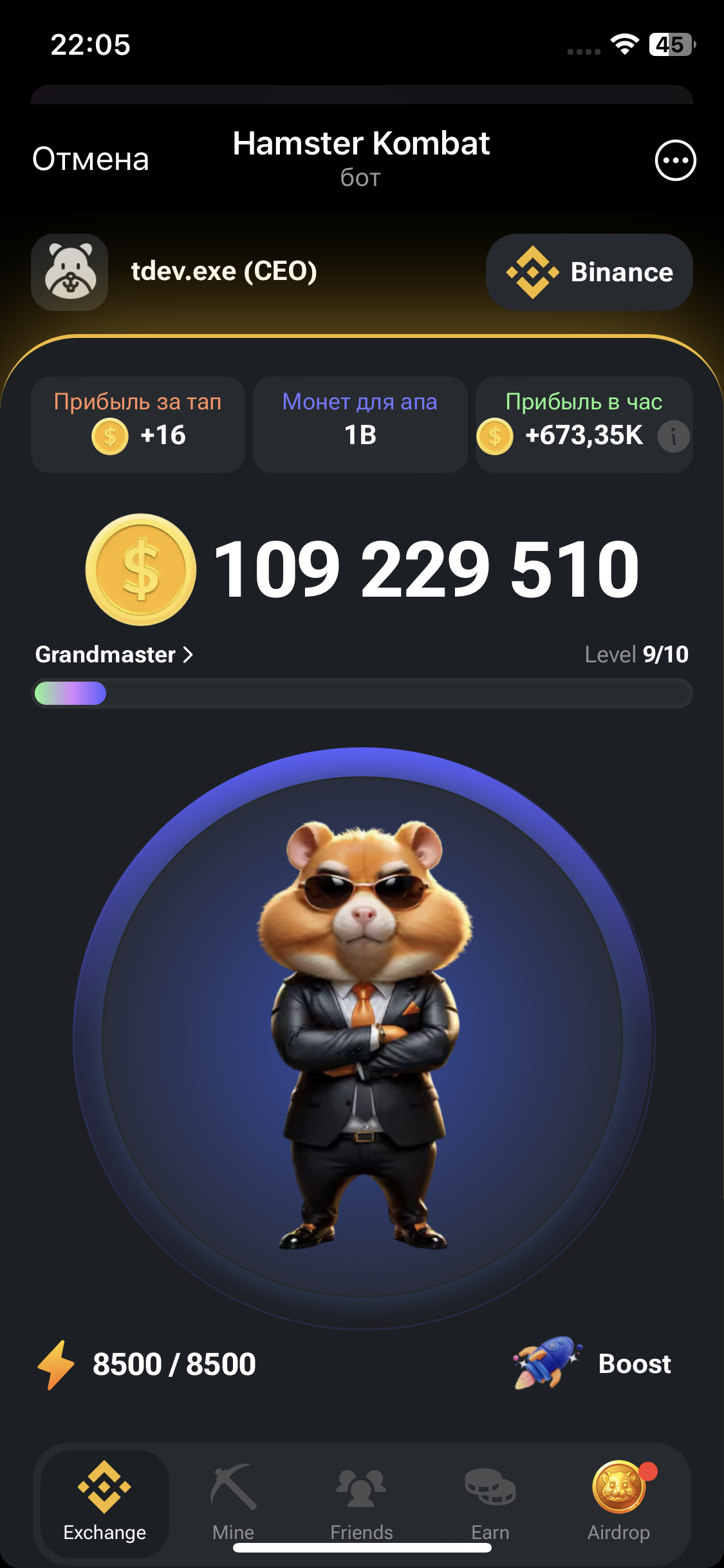 3 раза тыкаем на «прибыль за тап» в левом верхнем углу, переходим на красного хомяка, далее вводим сегодняшний шифр (WALLET)
