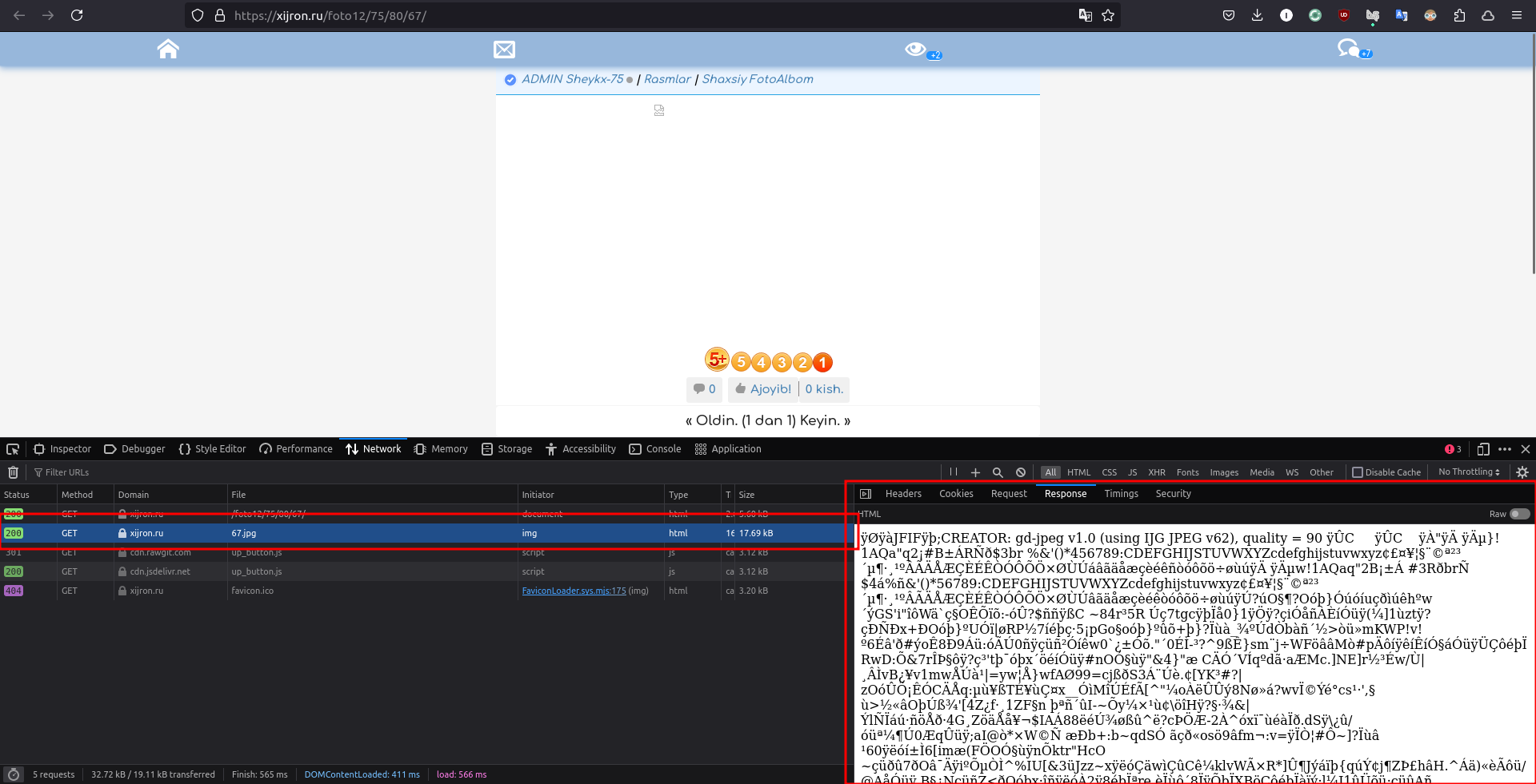 Ответ с изображением возвращается с заголовком Content-Type: text/html; charset=UTF-8, поэтому оно некорректно интерпретируется и отображается как текст.