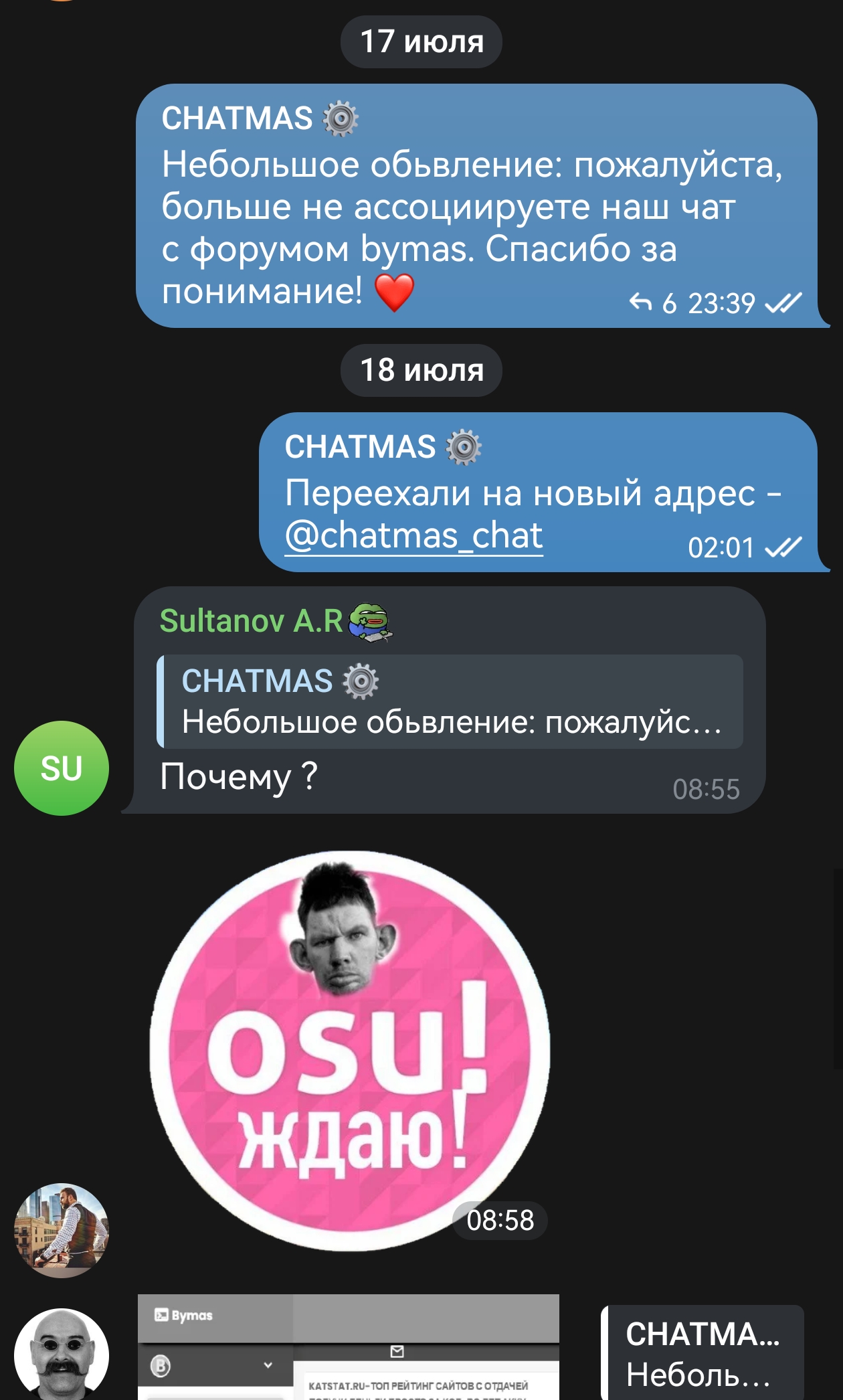 Чат никогда не был с какими-то проектом, просто вежливо попросил не ассоциировать больше с bymas, так как без предупреждения было сменено руководство, мало чего ты бы выкинул и как видишь, я не прогадал с этим. А так, если нужно, имя bymasair свободно, нужно пиши, обговорим, нет, тогда увы. 👉👈🥲