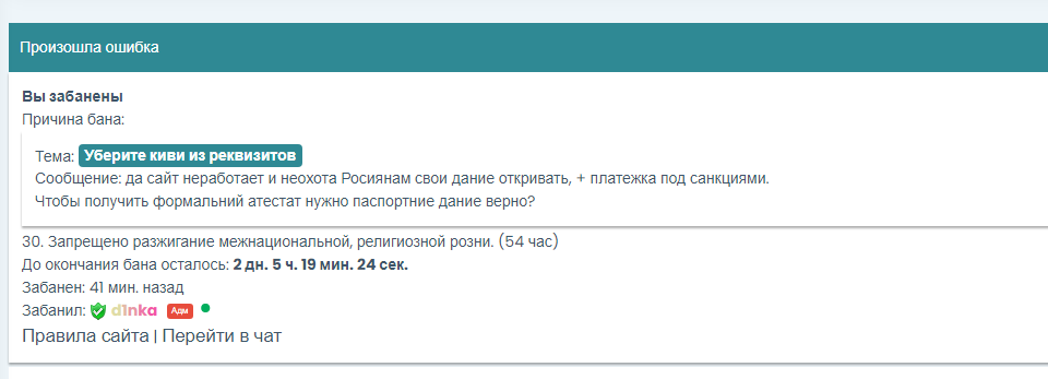 Один из администраторов заблокировал мой основной профиль мов я разжигаю конфлик илы что я там розжигаю, ребята у меня даже в мислы небыло чтото разжигать, обяснил человеку что вебмани под санкциями и Росиянам нехочу давать паспортние дание, что я такого плохого написал, никого не обозвал не послал. Я в шоке...