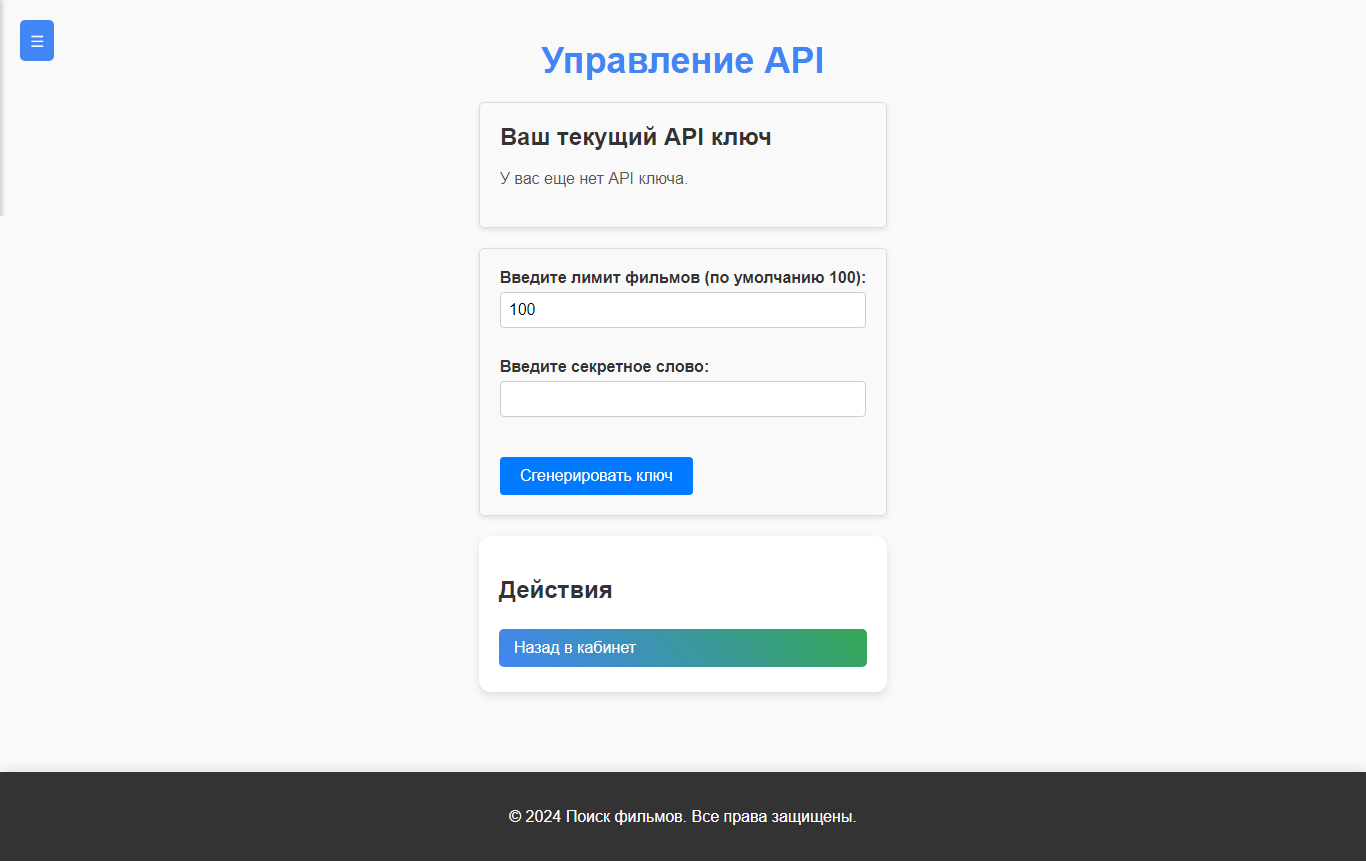 Пишу по свободному времени мини сайт тематики поиска фильмов. Для теста взял базу kodik-а https://filmtest.ramzet.net/ функционал скудненький но уже можно работать с сайтом. Что есть Автоирзация Регистрация Личный кабинет В личном кабинете имеется только API модуль API работает просто, вводим сколько хотим получить фильмов и секретное слово нажимаем Сгенерировать ключ . после этого создается ключ и посылаем запров в виде где api_key это ключ апи а secret_word секретное слово. таким образом указав к примеру 100 фильмов и перейдя по адресу будет выведен json с 100 фильмами. пример вывода так же есть возможность выводить 1000 фильмов за раз 10000 и т.д. хоть всю базу сайта за раз где это кол-во фильмов сами скриншоты и адрес сайта скину ниже прошу оценить задумку после теста и дать какие-то предложения. Скрипт под free использование. Будет загружен в зц. По этому предложения актуальны. На данный момент, база содержит 28000 фильмов.