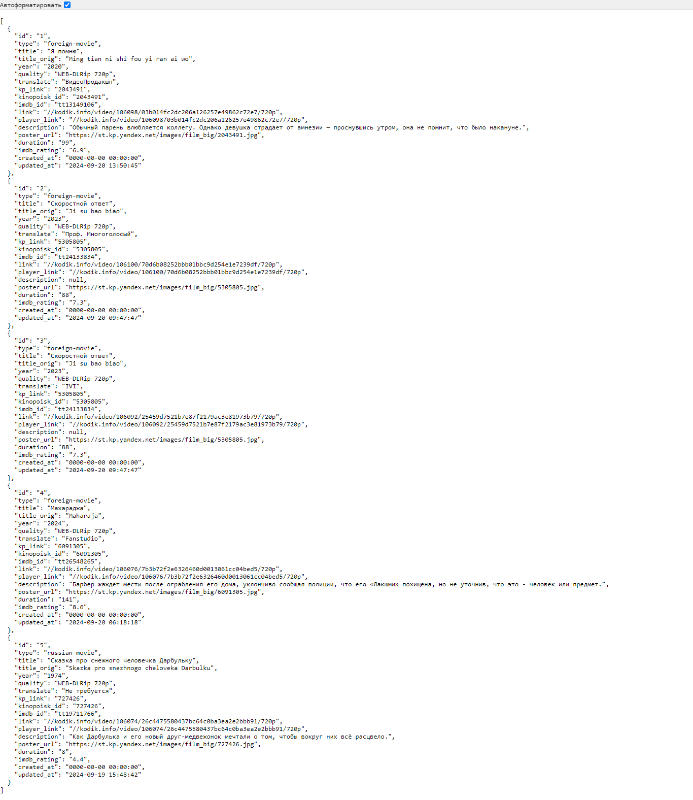{ "id": "1", "type": "foreign-movie", "title": "Я помню", "title_orig": "Ming tian ni shi fou yi ran ai wo", "year": "2020", "quality": "WEB-DLRip 720p", "translate": "ВидеоПродакшн", "kp_link": "2043491", "kinopoisk_id": "2043491", "imdb_id": "tt13149106", "link": "//kodik.info/video/106098/03b014fc2dc206a126257e49862c72e7/720p", "player_link": "//kodik.info/video/106098/03b014fc2dc206a126257e49862c72e7/720p", "description": "Обычный парень влюбляется коллегу. Однако девушка страдает от амнезии — проснувшись утром, она не помнит, что было накануне.", "poster_url": "https://st.kp.yandex.net/images/film_big/2043491.jpg", "duration": "99", "imdb_rating": "6.9", "created_at": "0000-00-00 00:00:00", "updated_at": "2024-09-20 13:50:45" }, { "id": "2", "type": "foreign-movie", "title": "Скоростной ответ", "title_orig": "Ji su bao biao", "year": "2023", "quality": "WEB-DLRip 720p", "translate": "Проф. Многоголосый", "kp_link": "5305805", "kinopoisk_id": "5305805", "imdb_id": "tt24133834", "link": "//kodik.info/video/106100/70d6b08252bbb01bbc9d254e1e7239df/720p", "player_link": "//kodik.info/video/106100/70d6b08252bbb01bbc9d254e1e7239df/720p", "description": null, "poster_url": "https://st.kp.yandex.net/images/film_big/5305805.jpg", "duration": "88", "imdb_rating": "7.3", "created_at": "0000-00-00 00:00:00", "updated_at": "2024-09-20 09:47:47" } ] php