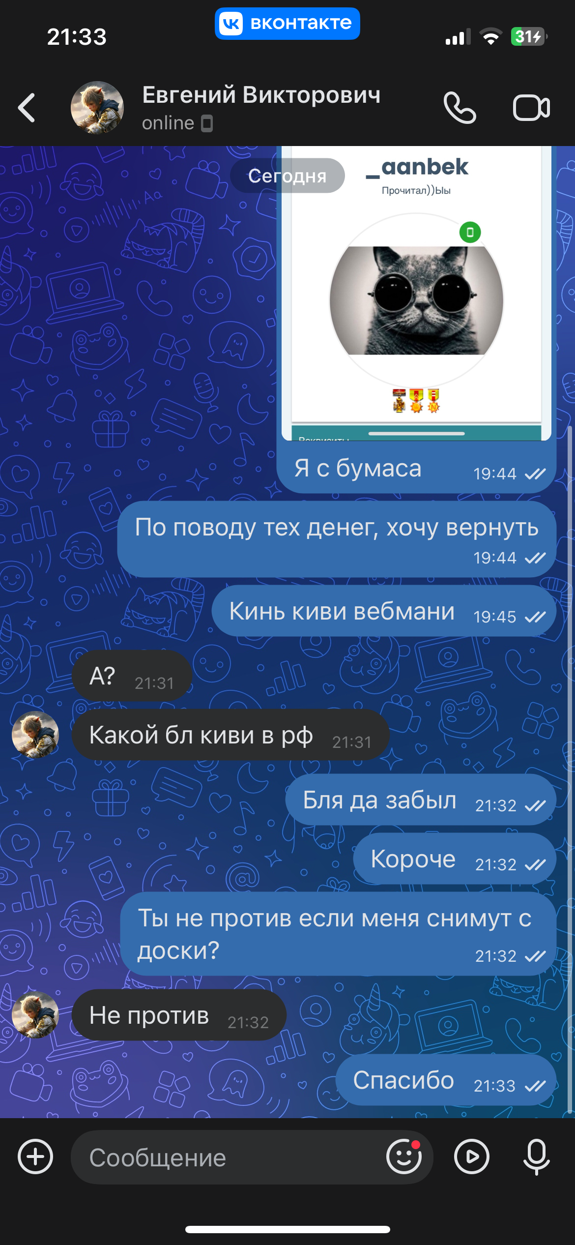 _aanbek , Он очень частый гость в ВК, думаю надо бы сначала с ним связаться, по возможности сюда вернуть или провести возврат долга и приложить скрины в этой теме. Ссылка на профиль - vk.com/destitsme