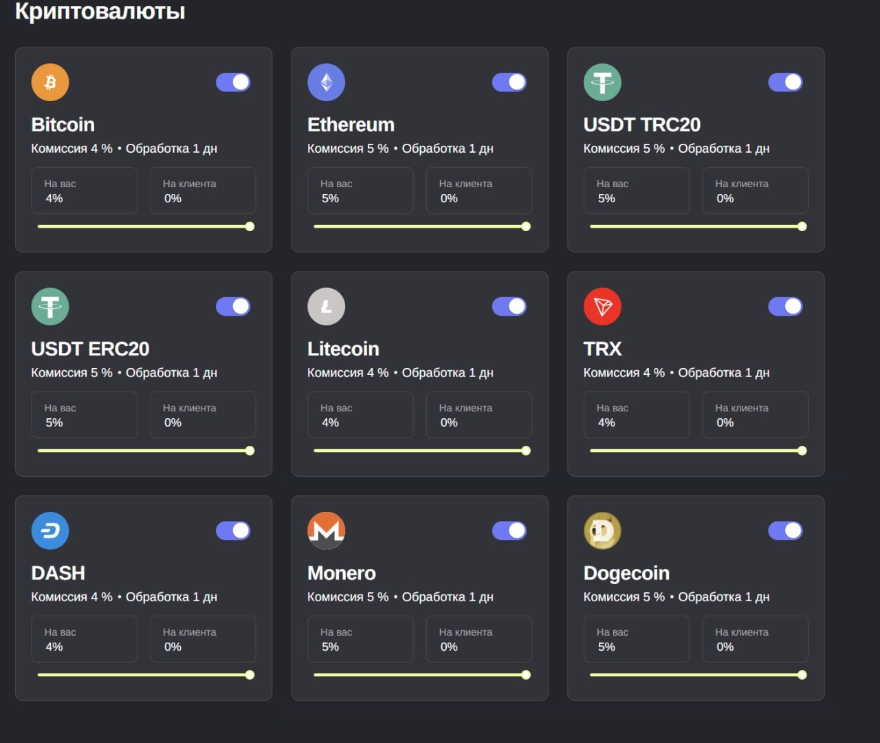 После подключения нашего сервиса к вашему сайту, в разделе управления проектом настройте список криптовалют, которые вы хотите принимать. Здесь вы можете выбрать, например, биткойн или другие цифровые валюты, а также настроить комиссии.