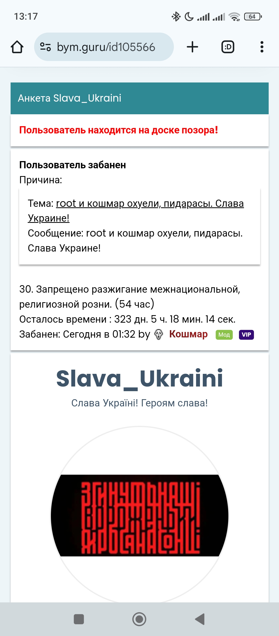 6. Снять блокировку или уменьшить срок, убрать т.н. Кошмара из администрации сайта