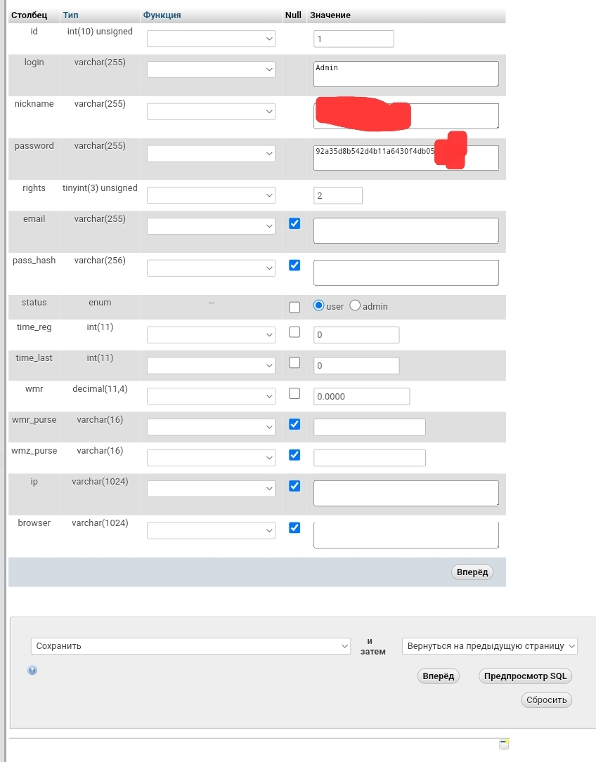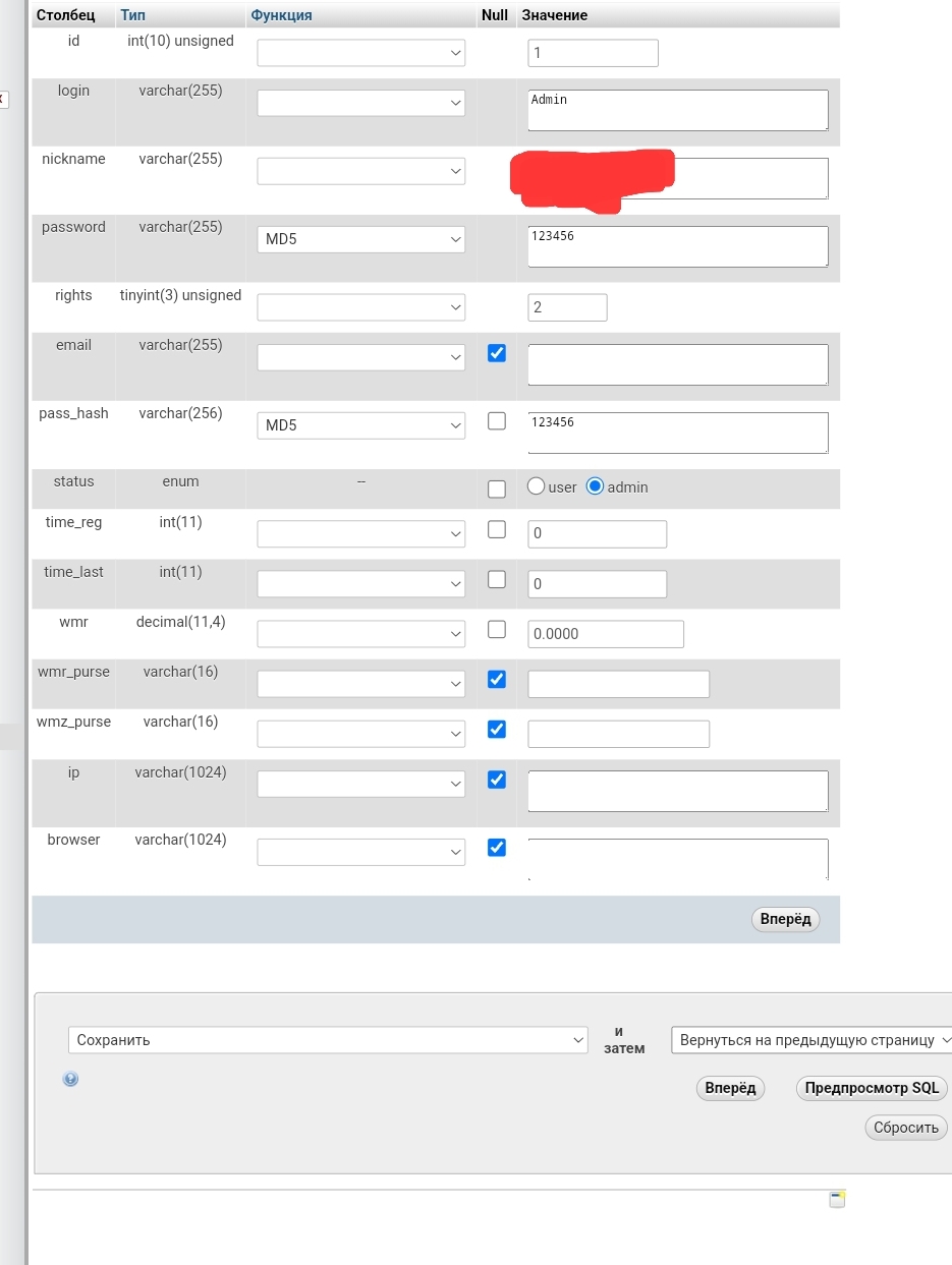 Открой любой md5 husher, сделай пароль и захешируй его. И данный хеш вставь в колонку пароля. Ну если у тебя пароли в мд5 хешируются