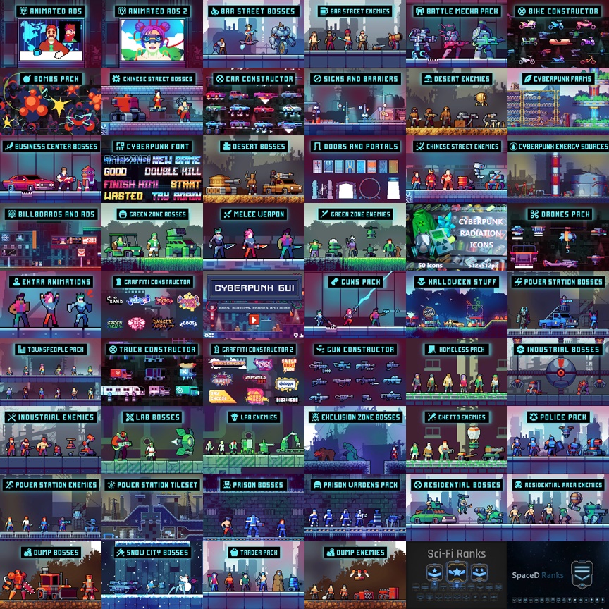 Погрузитесь в мрачный и захватывающий мир киберпанка с этим обширным набором спрайтов и ассетов в пиксельной графике! Этот комплект станет незаменимым инструментом для разработчиков игр, стремящихся создать аутентичную и детализированную вселенную в стиле киберпанк.