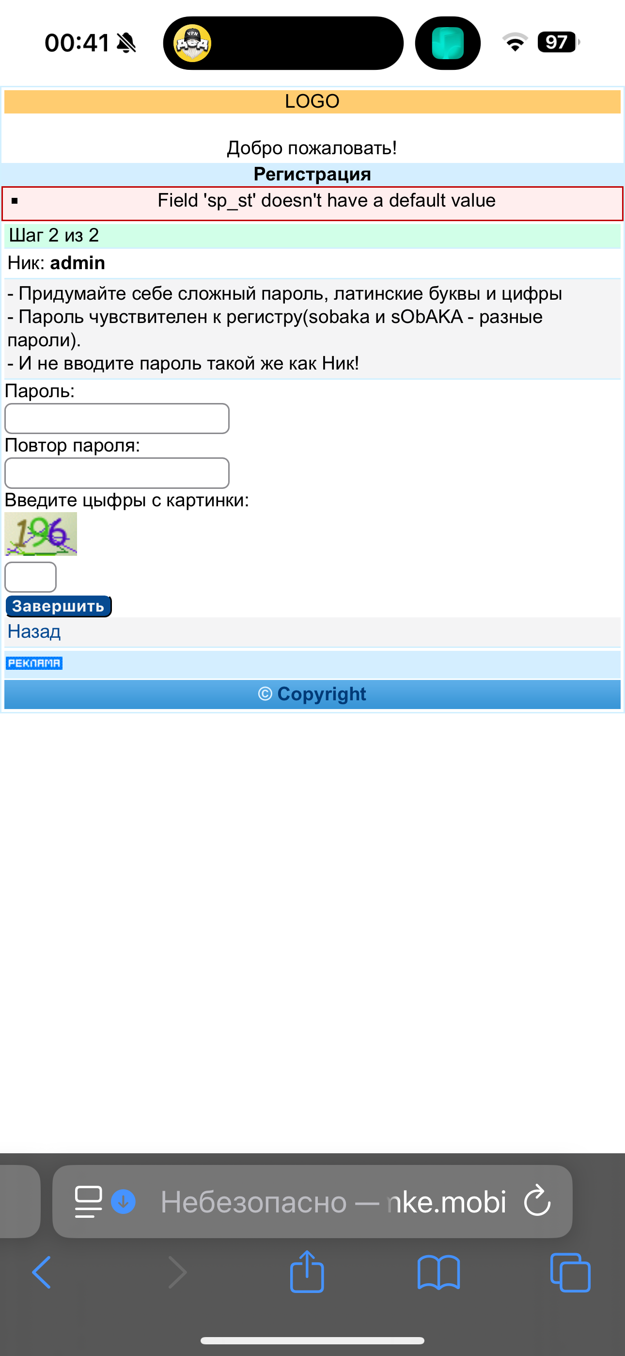 Нужна помощь с двигом соцки кота.Не работает регистрация пишет ошибку Field 'sp_st' doesn't have a default value