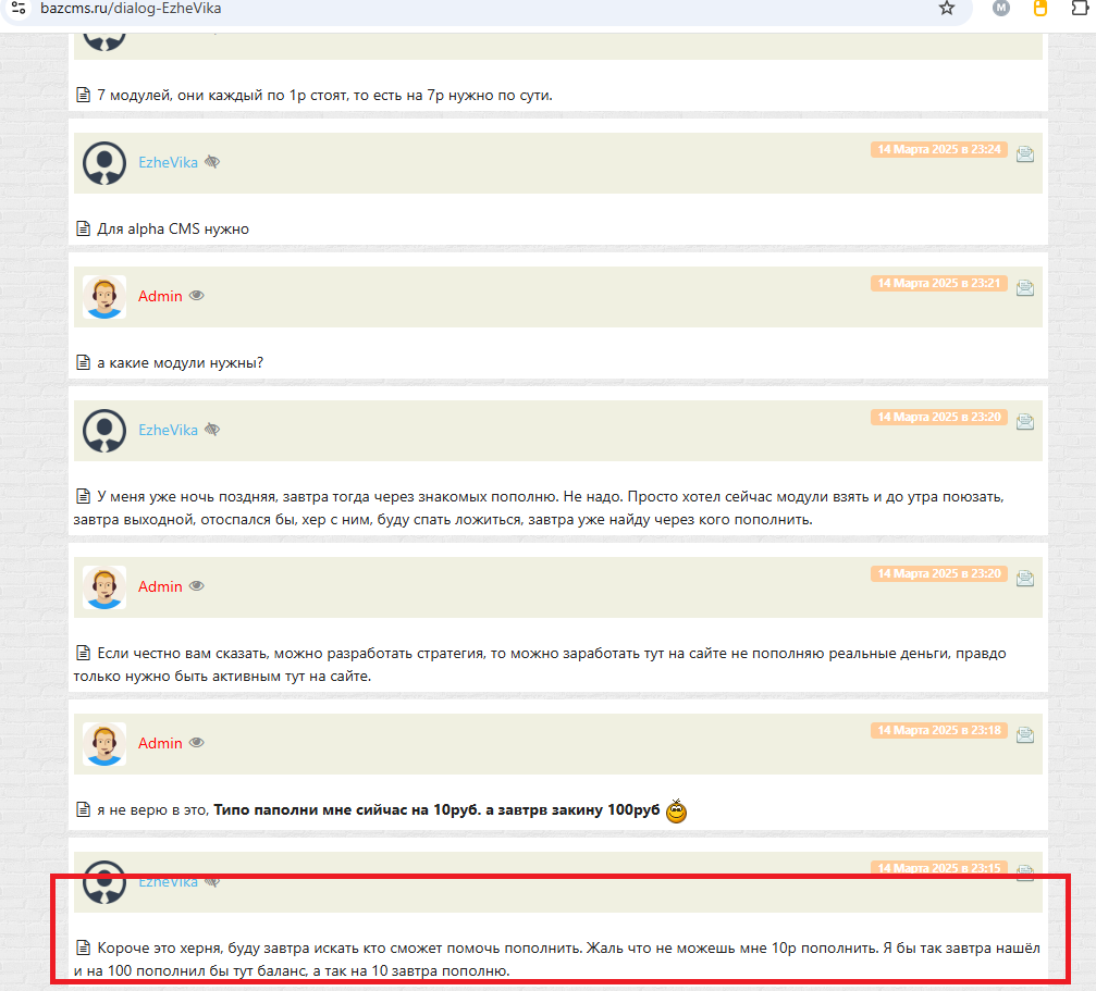 Далее когда я ему в темах начал писать что модули скачены с bazcms то он начел плакать в жалетку админов чтоб повесили нас на доску, вот тема https://bym.guru/forum/topic/159764.