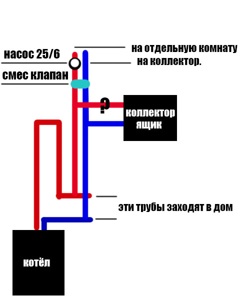 Есть тут случайно сантехник, кто разбирается отоплением? Нарисовал такую схему. Вопрос. Будет ли работать тёплые полы без насоса, если установлен насос верху. На скрине всё подробнее написана. Где вопрос знак, нужен насос, и смесительный узел?