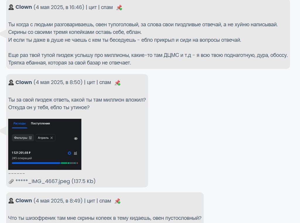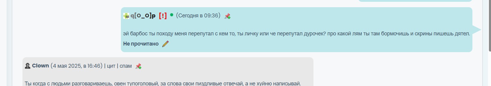 Зашел почитать личку от знакомого и тут вижу в личке предъявы от какого то Clown , причем в грубой форме .. нехера непонял.. смотрите на скринах за какой то лям мне базарит. я думал может чет не помню.. но факт в том что это было 4 мая, могу модеры по заходам потвердеть я как минимум с апреля тут точно небыл. я редкий гость тут ...