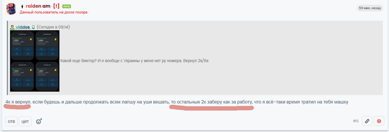 Вместо того чтобы решать ситуацию что ты сделал? Перебежал на другой сайт, где хаял нас. Все тут плохие, а там наоборот, хорошие. Что произошло дальше? Дальше тебя повесили на доске и там, и о чудо, там тоже в миг все стали плохими. У тебя была возможность решить всю эту ситуацию, но вместо этого ты только создавал темы с оскорблениями что на том сайте, что тут. Все мошенники.