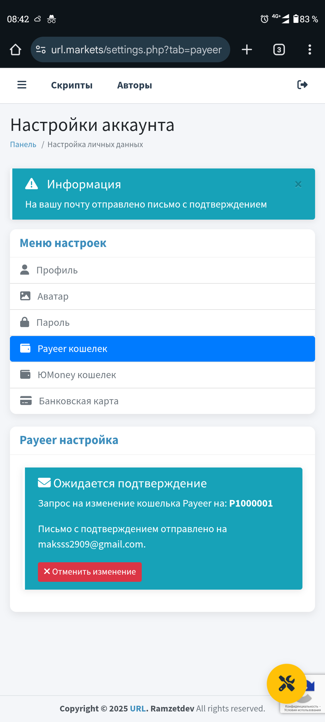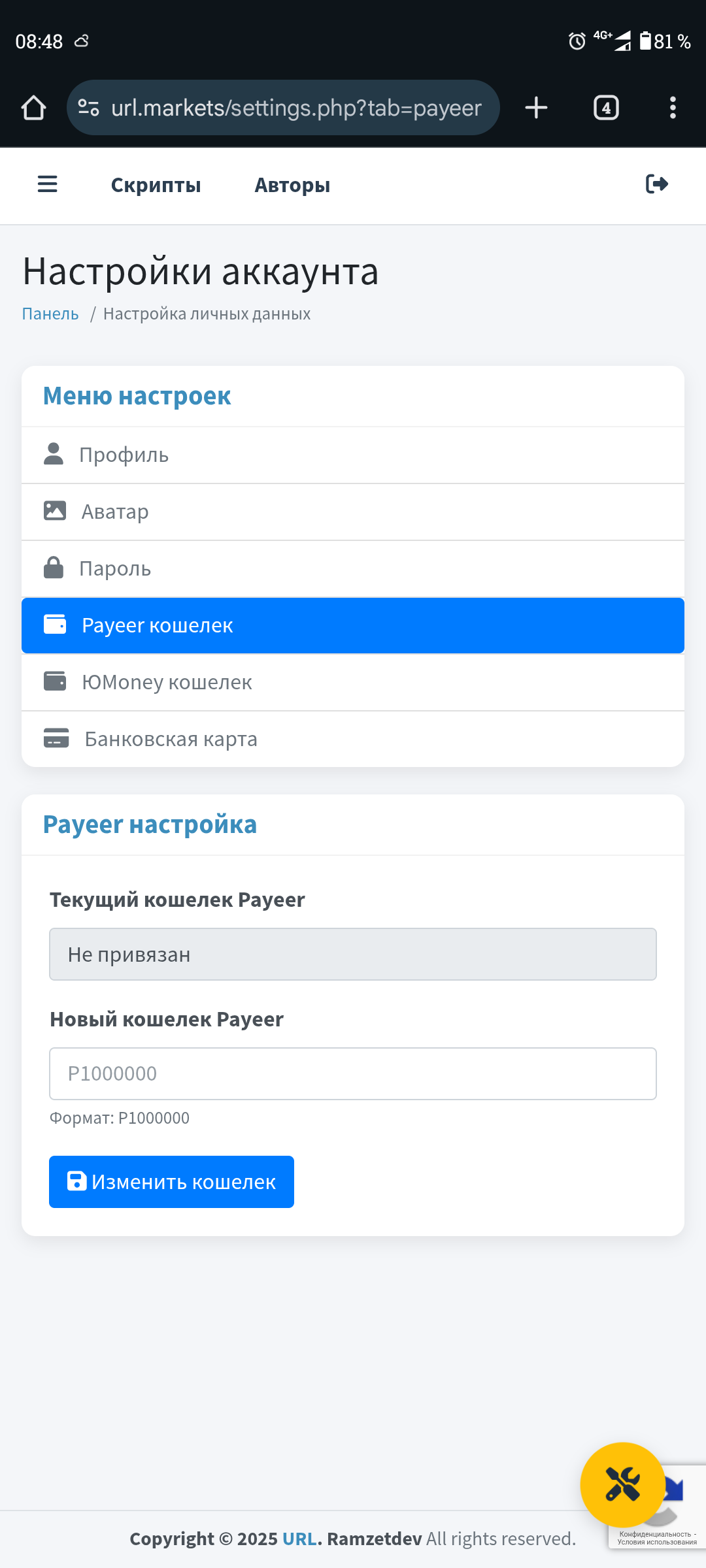 Страница настроек. Дальше планируется заказ вывода на данные реквизиты. Пока что реализован заказ вывода только на payeer