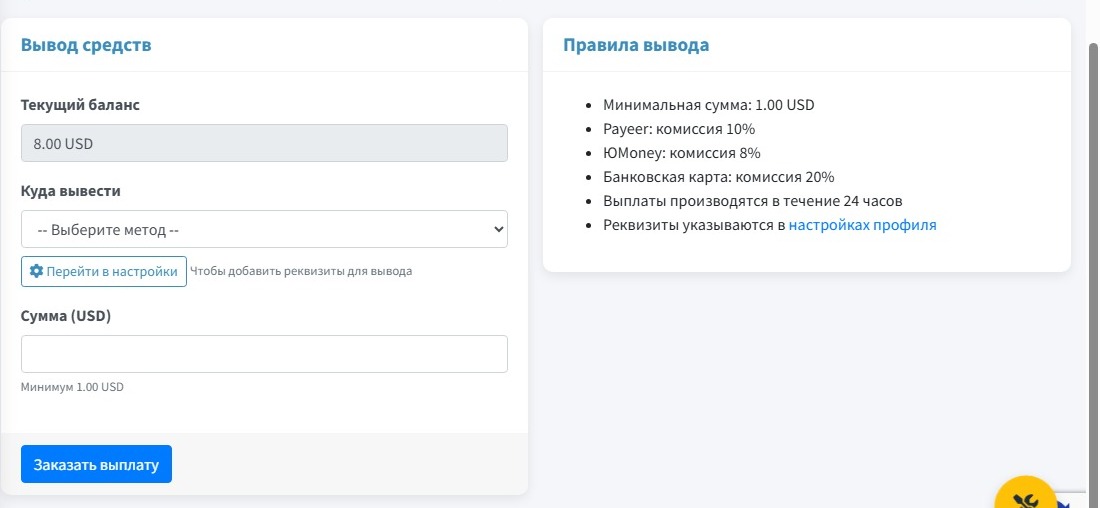 Как это работает. У вас купили товар, вы переходите на страницу выплаты, заказываете выплату на один из кошельков, ровно через 6 часов сумма выплачивается на ваши реквизиты в автоматическом режиме.