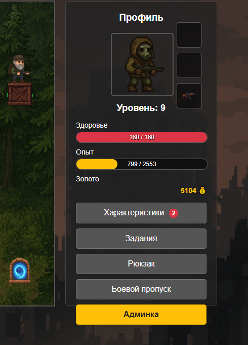 Добавили ячейки для снаряжения в профиле возле Персонгажа.Пока что 3 ячейки для головы,тела и оружия.Снаряжение принадевании дает характеристи персонажу,а так же отображаеться в ячейке