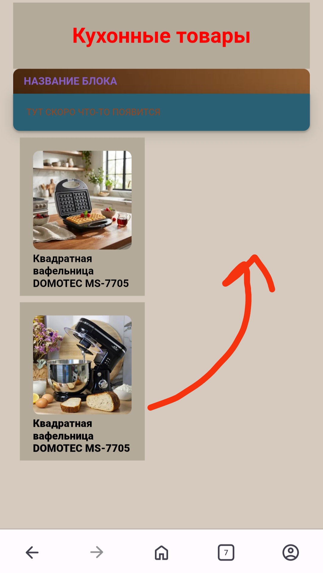 <!DOCTYPE html> <html lang="ru"> <head>   <meta charset="UTF-8">    <!-- ВАЖНО: исправляет масштаб на телефоне -->   <meta name="viewport" content="width=device-width, initial-scale=1.0">    <title>Кухонные товары</title>    <style>     * {       box-sizing: border-box;     }      body {       margin: 0;       font-family: Arial, sans-serif;       background: #d8cfc2;     }      /* Заголовок */     .title {       text-align: center;       color: red;       margin: 15px 0;       font-size: 22px;     }      /* Верхний блок */     .info-block {       width: 90%;       margin: 0 auto 25px;       border-radius: 12px;       overflow: hidden;     }      .info-title {       background: #6a3d1c;       color: #8a7dff;       padding: 12px;       font-weight: bold;       font-size: 14px;     }      .info-text {       background: #2f6c82;       color: #c0c0c0;       padding: 15px;       font-size: 13px;     }      /* Контейнер товаров */     .products {       display: flex;       gap: 20px;       padding: 0 15px;     }      /* Карточка товара */     .product-card {       background: #bfb6a7;       padding: 12px;       border-radius: 16px;       width: 170px;       height: 260px;        display: flex;       flex-direction: column;     }      /* Заглушка */     .image-placeholder {       width: 100%;       height: 140px;       background: #9a9a9a;       border-radius: 12px;        display: flex;       align-items: center;       justify-content: center;        color: #fff;       font-size: 16px;       margin-bottom: 10px;     }      /* Название */     .product-title {       font-weight: bold;       font-size: 14px;       margin-top: auto; /* ВЫРАВНИВАЕТ ТЕКСТ */     }      /* Адаптация */     @media (max-width: 600px) {       .products {         justify-content: center;       }     }   </style> </head>  <body>    <h1 class="title">Кухонные товары</h1>    <div class="info-block">     <div class="info-title">НАЗВАНИЕ БЛОКА</div>     <div class="info-text">ТУТ СКОРО ЧТО-ТО ПОЯВИТСЯ</div>   </div>    <div class="products">     <div class="product-card">       <div class="image-placeholder">Фото</div>       <div class="product-title">         Квадратная вафельница<br>         DOMOTEC MS-7705       </div>     </div>      <div class="product-card">       <div class="image-placeholder">Фото</div>       <div class="product-title">         Квадратная вафельница<br>         DOMOTEC MS-7705       </div>     </div>   </div>  </body> </html>