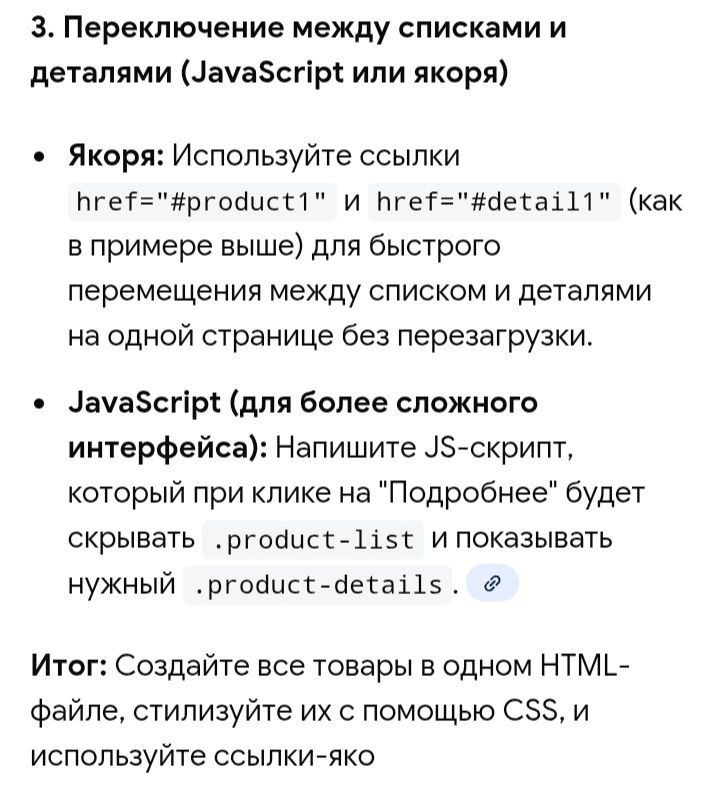 <!DOCTYPE html> <html lang="ru"> <head>     <meta charset="UTF-8">     <meta name="viewport" content="width=device-width, initial-scale=1.0">     <title>Каталог товаров 2026</title>     <style>         /* Основные стили */         body {             font-family: Arial, sans-serif;             line-height: 1.6;             max-width: 1200px;             margin: 0 auto;             padding: 20px;             background-color: #f4f4f4;         }          h1 { text-align: center; color: #333; }          /* Сетка товаров */         .product-list {             display: grid;             grid-template-columns: repeat(auto-fit, minmax(250px, 1fr));             gap: 20px;             margin-bottom: 40px;         }          .product-card {             background: #fff;             border: 1px solid #ccc;             padding: 15px;             text-align: center;             border-radius: 8px;             box-shadow: 2px 2px 5px rgba(0,0,0,0.1);             transition: transform 0.2s;         }          .product-card:hover {             transform: translateY(-5px);         }          .product-card img {             max-width: 100%;             height: 150px;             object-fit: cover;             border-radius: 4px;             background-color: #eee;         }          .details-link {             display: inline-block;             margin-top: 10px;             padding: 8px 16px;             background: #007bff;             color: white;             text-decoration: none;             border-radius: 4px;         }          /* Блоки с деталями */         .product-details {             display: none; /* Скрыто по умолчанию */             background: #fff;             padding: 30px;             border: 2px solid #007bff;             border-radius: 8px;             margin-top: 20px;             animation: fadeIn 0.5s;         }          .back-link {             color: #007bff;             text-decoration: none;             font-weight: bold;         }          @keyframes fadeIn {             from { opacity: 0; }             to { opacity: 1; }         }     </style> </head> <body>      <h1>Наши товары</h1>      <!-- Список товаров -->     <div class="product-list">                  <div class="product-card" id="product1">             <img src="via.placeholder.com" alt="Товар 1">             <h2>Смартфон X</h2>             <p>Мощный процессор и отличная камера для снимков в 2026 году.</p>             <a href="#detail1" class="details-link" onclick="showDetail('detail1')">Подробнее</a>         </div>          <div class="product-card" id="product2">             <img src="via.placeholder.com" alt="Товар 2">             <h2>Ноутбук Pro</h2>             <p>Легкий и быстрый инструмент для работы из любой точки мира.</p>             <a href="#detail2" class="details-link" onclick="showDetail('detail2')">Подробнее</a>         </div>      </div>      <!-- Блоки с детальной информацией -->     <div class="product-details" id="detail1">         <a href="#product1" class="back-link" onclick="hideAll()">← Назад к списку</a>         <h3>Детали Смартфона X</h3>         <p>Здесь находится полное описание технических характеристик, цены и отзывы на первый товар. Этот блок появляется только при клике.</p>     </div>      <div class="product-details" id="detail2">         <a href="#product2" class="back-link" onclick="hideAll()">← Назад к списку</a>         <h3>Детали Ноутбука Pro</h3>         <p>Подробная информация о втором товаре: время автономной работы, объем памяти и возможности экрана.</p>     </div>      <script>         function showDetail(detailId) {             // Сначала скрываем все открытые детали             hideAll();                          // Показываем нужный блок             const target = document.getElementById(detailId);             if (target) {                 target.style.display = 'block';                 // Плавная прокрутка к деталям                 target.scrollIntoView({ behavior: 'smooth' });             }         }          function hideAll() {             const allDetails = document.querySelectorAll('.product-details');             allDetails.forEach(detail => {                 detail.style.display = 'none';             });         }     </script>  </body> </html>