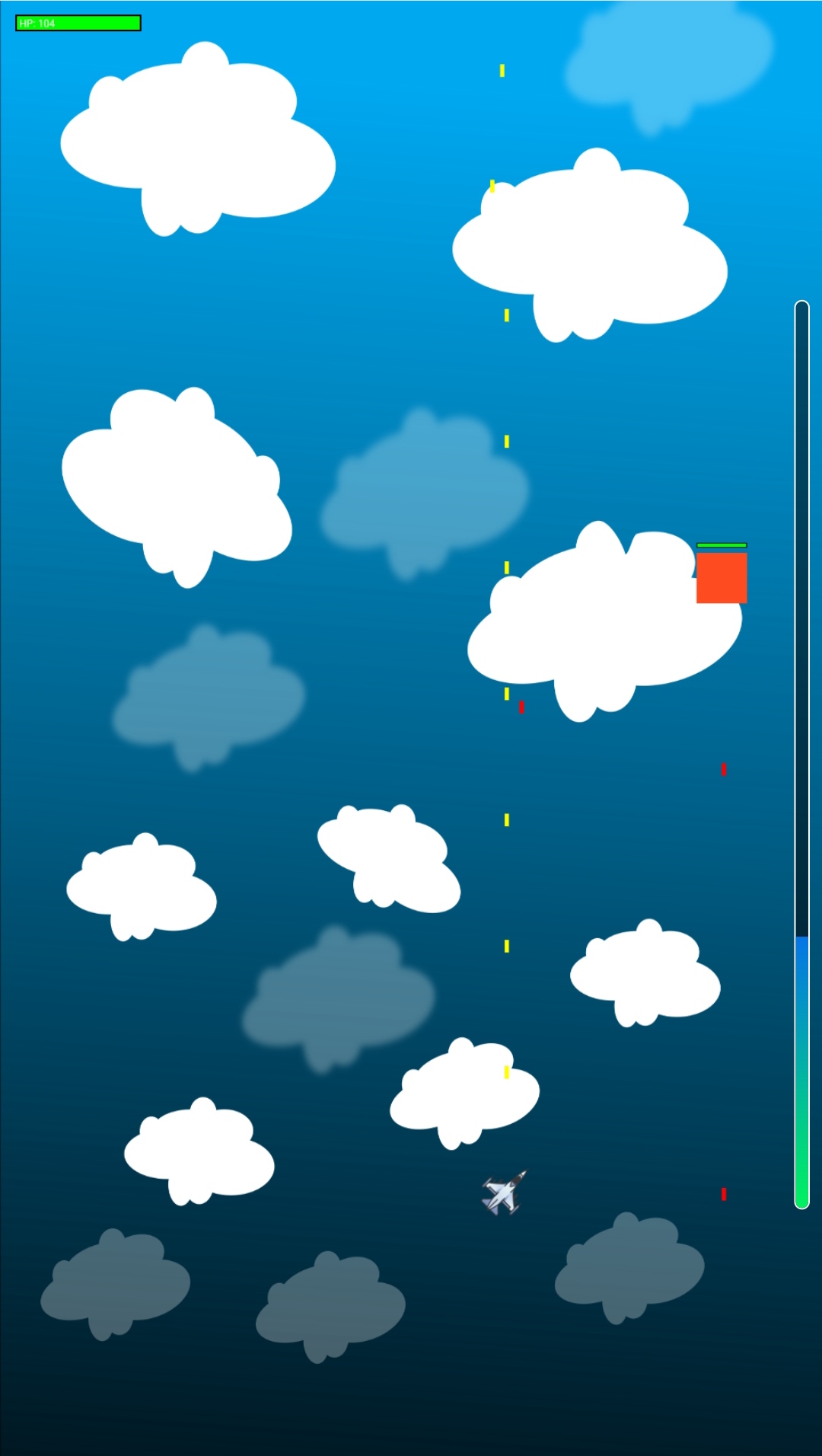 Сам уровень.Пока мобы квадратики ,сейчас делаю все без стиля ,потом добавлю анимационные самолёты и врагов .Управление пальцем ,автоматическая атака пока ,мб сделаю в настройках переключение
