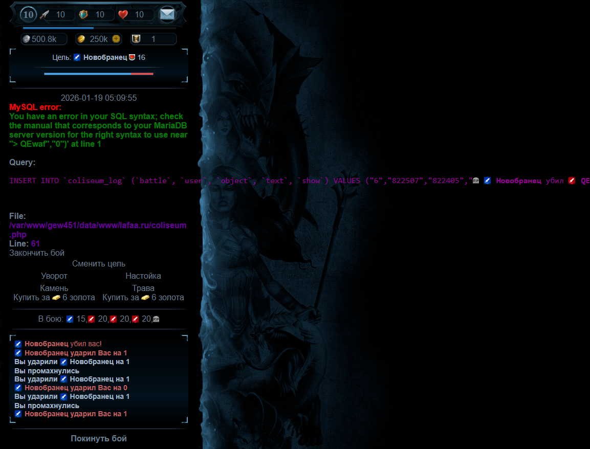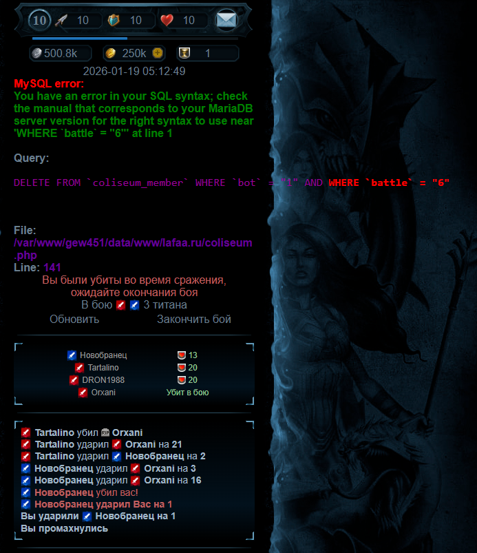 Ошибка появляется только в момент когда убивают или когда выходишь с боя но если обновить страницу то просто пропадает ошибка