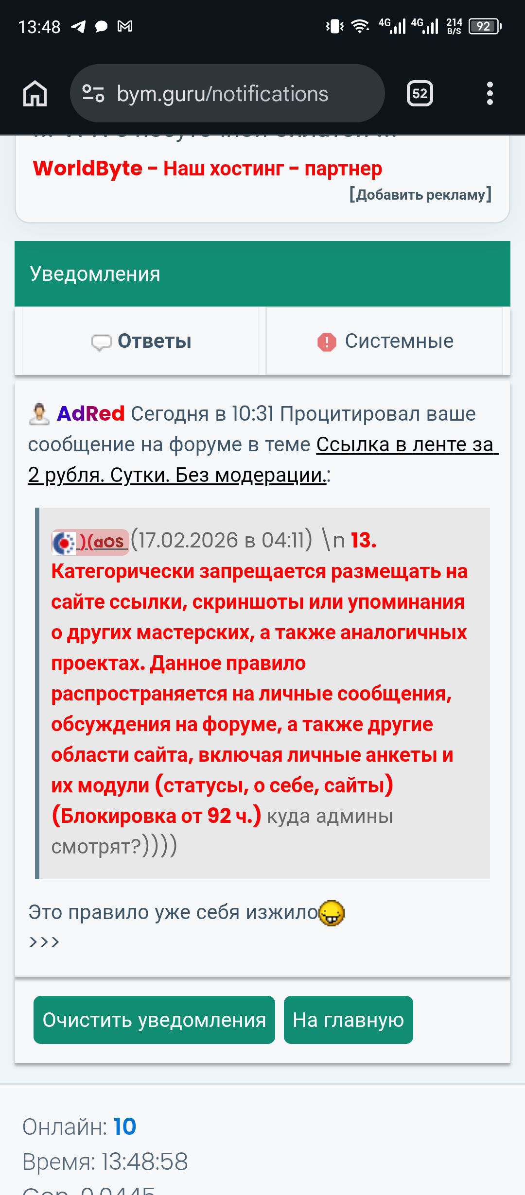 (Сегодня в 14:15)Правила проекта не являются формальностью и применяются ко всем участникам без исключения. В указанной теме нарушение действительно имело место и тема содержала ссылку на сайт аналогичный бумасу, но именно в данной теме не было прямой рекламы ВМ проекта и не было призыва переходить туда. Тема была связана с покупкой рекламы на этом проекте. Никто просто так баны не раздаёт и не делит пользователей. Всегда учитывается контекст нарушения и характер ситуации. Дабы избежать дальнейших споров и недопонимания со стороны пользователей, блокировка всё же была выдана в соответствии с правилами.